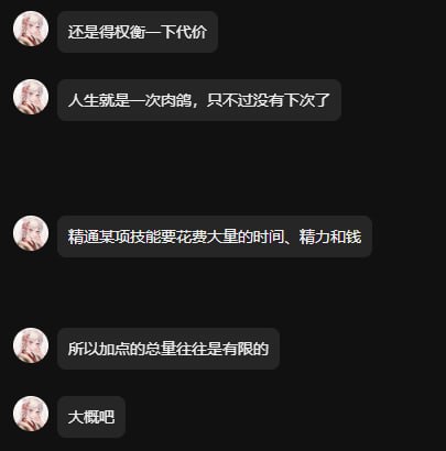 几年前 ai 绘图兴起的时候我还能淡定自若地分析,随后就是 chatgpt、copilot、sora,如今 ai 占领的领域离我越来越近,真是越来越笑不出来了,其实底层人也没那么在乎什么灵魂啊本质的,他们只想知道这玩意会不会让他们失业而已。大家都知道 ai 作品和人类作品背后的那些东西是不同的,大数据终究不能代替独特的记忆与鲜活的人生,但只要大多数人一天没到能看出来的水平,ai 就一天不会停止它的步伐。时代的车轮滚滚向前,你我都终将成为新时代的卢德分子。有时候我还是会想自己是不是其实不适合学计算机。不是妄自菲薄,其实我觉得如果不擅长还不敢承认那才是真的愚蠢。因为其实有很多现象能说明这件事情,比如我学得没有 rika 快,我在概念的理解上可以比一般人快而且好,但是往往一上实战就会手足无措。我说这个的意思不是说我想放弃,我只是在思考我是不是确实没有这方面的天赋,没有天赋不意味着我不能做这一块的工作,世上千千万万程序员,总不能说人人都能算得上有天赋,但是相比于那些人,我要花费更多甚至数倍的精力去学同样的内容,这就是差异所在。我是个要强的人,平时也不会随随便便就说我不如别人,但人终究不可能是全才,有些方面不如人就是不如人,这也没什么不好承认的。