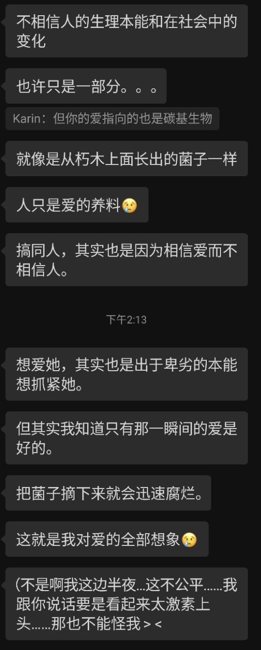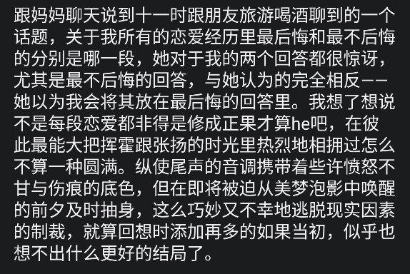 昨晚脑子有点超载了,逼自己把回忆一一摆出来呈现,甚至会涌现很多在不写下文字时根本不会想起的,琐碎的细节,让那段时光尝起来格外辛辣。我毕竟终究要成长,也不可能在每一段人生里都对感情抱有初心一般的纯洁和真挚,总要犯错,总要后悔,总要自我厌恶,这是个不可避免的过程。把这些东西写下来,一者希望它们能留存更久一些,二者寄文以缘情,三则是给想要了解我复杂性的人一条便捷的途径,了解如今的我是如何被塑造的。前两个目的是向内寻求价值,最后一个则仰赖于外部的反馈,所以我讲出我的历史,漆黑也好纯白也罢,总归是先做好了被讨厌的心理准备的。